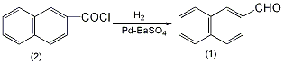 in a reaction flask equipped with a stirrer, dropping funnel, ventilation tube (extending into the bottom of the reaction flask), and a reflux condenser, add 57g (0.3mol) of β-naphthoyl chloride (2) and 200ml of metallic sodium-dried dichloride. toluene, 6gpd-baso4 catalyst. replace the air in the reaction bottle with hydrogen. pour hydrogen gas into the oil bath at 140-150°c with vigorous stirring at a ventilation rate of 1-2 bubbles/second. hydrogen chloride gas escapes (can be absorbed by alkali). the reaction takes about 2 hours to complete (can be judged by checking whether hydrogen chloride escapes). cool and filter off the catalyst. activated carbon decolorizes. the xylene is distilled off. then distill under reduced pressure, collect the fraction at 147~149℃/2.0kpa, and solidify after cooling to obtain 19g of β-naphthaldehyde (1), mp59~60℃. yield 80%. [1]