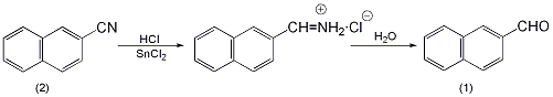 into a reaction bottle equipped with a stirrer, dropping funnel, ventilation tube, and reflux condenser, add 400 ml of anhydrous ether and 76 g of anhydrous stannous chloride. dry hydrogen chloride gas was introduced under cooling until saturated, and the reaction liquid was divided into two layers. a solution of 30.6g (0.2mol) of β-naphthylcarbonitrile (2) dissolved in 200ml of anhydrous ether was added dropwise under stirring, and then dry hydrogen chloride gas was introduced. stir quickly and let sit overnight. the solid was filtered off and washed with diethyl ether. add the solid matter to another reaction bottle, add water, and perform steam distillation. the distillate cools and a solid precipitates. after suction filtration and drying, 25g of β-naphthaldehyde (1) was obtained, with a yield of 80%. distill under reduced pressure, collect the fraction at 156~158℃/2.0kpa, and solidify after cooling. mp57~58℃[2]