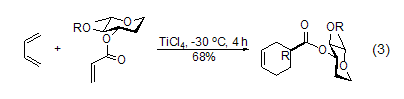 with 1,3-d in the cycloaddition reaction of dienes, the addition reaction using sugar as a chiral auxiliary compound has stereoselectivity [4]. the reaction of 3-o-acryloyldihydro-l-rhamnose (r = pivaloyl) gives (r)-cycloadduct (r /s=95:5) (formula 3).