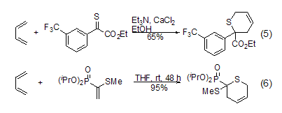 butadiene can be passed through diels- alder reaction synthesizes the thiopyran ring structure in the molecule (formula 5)[6]. the diels-alder cycloaddition reaction of disulfide methyl phosphate and 1,3-butadiene is a new synthesis method of thiopyran derivatives. lewis acid catalyst controls the reaction rate and selectivity (formula 6)[7].