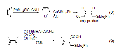 reaction of 1,3-butadiene with cyanocuprate reagent (phme2sicu- cnli), copper attack the carbon atom of the end chain of the olefin to generate an intermediate product, which is then reduced and eliminated. copper (i) captures the anion and undergoes a 1,4-addition reaction to generate a cis product (formula 8). and with co2if this reaction is carried out as a nucleophile, a 1,2-addition reaction will occur (formula 9)[9].