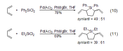 in the catalyst pd(ac)2, dichlorosilane and 1,3-butadiene only undergo a cyclization reaction to generate 2,5-divinylsilane (formula 10, formula 11)[10].