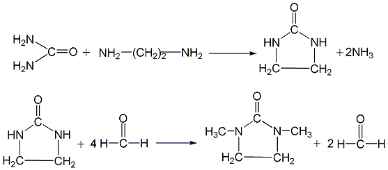 first, urea and ethylenediamine undergo a ring-closing reaction in an ethylene glycol solution to generate 2-imidazolinone, and then 2-imidazolinone reacts with formaldehyde and formic acid to generate 1,3-dmi.
