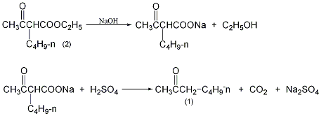 in a reaction bottle equipped with a stirrer, add 186g (1mol) of n-butylacetoacetate (2) ethyl acetoacetate (2) and 1l (5%) sodium hydroxide aqueous solution, and stir vigorously at room temperature for 5 hours. extract with a small amount of benzene to remove unreacted ester. slowly pour it into 100ml (50%) sulfuric acid, and carbon dioxide gas will escape immediately. after the carbon dioxide escapes slowly, heat and distill. the distillate is made alkaline with concentrated sodium hydroxide and then distilled. the oil layer is separated, the water layer is distilled again, and the oil layer is separated again. the organic layers were combined, dried over anhydrous sodium sulfate, fractionated, and the fractions at 148-150°c were collected to obtain 65g of 2-heptanone (1) with a yield of 56%. [24]