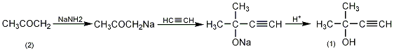 in a reaction bottle equipped with a stirrer, dropping funnel, reflux condenser (ammonia drying tube), and ventilation tube, add 1l of anhydrous ether and 156g (4mol) of very finely ground sodium amide, and cool in an ice-salt bath slowly add 232g (4mol) of anhydrous acetone (2) dropwise, and complete the addition in about 3 hours. cool to -10°c and slowly introduce acetylene gas flow for 2 hours to drive out ammonia. put one end of the air inlet pipe deep into the bottom of the bottle, and connect the other end to the acetylene gas cylinder. the stopper is tied tightly with a metal wire. cool it in an ice-salt bath and place the entire device on a vibrator. shake vigorously and react for 10 hours (maintaining an acetylene pressure of 0.7mpa). n). open the piston to relieve pressure every 30 minutes to remove ammonia. after the reaction is completed, slowly pour the reactant into 800g of crushed ice, and add 400 ml of 20 mol/l sulfuric acid for acidification while cooling. the organic layer was separated, and the aqueous layer was extracted twice with diethyl ether. the ether layers were combined and dried over anhydrous potassium carbonate. filter, recover the solvent and then fractionate, collect the fraction at 103-107°c to obtain 135-155g of colorless liquid compound (1), with a yield of 46%. [1]