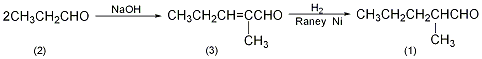 2-methyl-pentene-2-aldehyde (3): in a reaction bottle equipped with a stirrer, thermometer, and dropping funnel, add 20g of solid sodium hydroxide (0.5mol) and 650ml of water. water bath cooling. add 1000g (16.9mol) of 98% propionaldehyde dropwise at 20°c with stirring. after the addition is completed, the temperature is raised to 40°c and the reaction is maintained for 20 minutes. cool to below 20°c, separate the organic layer, wash with a small amount of water, and distill under normal pressure. collect the fraction between 125 and 140°c to obtain 1520g of 2-methyl-pentene-2-aldehyde (3), with a yield of 90%. 2-methylpentanal (1): add 1.5kg (15.3mol) of the above compound (3) and 100g of ranney ni catalyst into a high-pressure reaction kettle, replace the air with nitrogen, and then replace the nitrogen with hydrogen. pass hydrogen at 100℃ and 1.3~1.5mpa pressure until the absorbed hydrogen reaches the theoretical amount or no more hydrogen is absorbed. after cooling, release the remaining liquid. filter, the filter cake is ranney ni and can be reused. the filtrate was 2-methylpentanal (1), weighing 1220g, and the yield was 90%. [1]