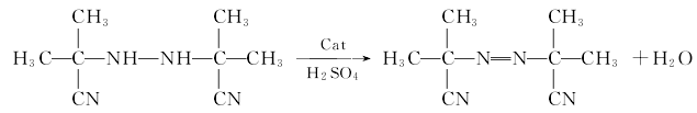 oxidation reaction: add the diisobutyronitrile hydrazine obtained from the condensation reaction, the oxidation medium, that is, 98% sulfuric acid, the waste acid from the oxidation reaction, and the catalyst into the oxidizer, stir, and mix the waste acid with sodium chlorate or potassium chlorate at a uniform speed within 1.5 hours. the prepared oxidant solution was added dropwise into the oxidizer, keeping the temperature at 25-30°c, and continuing the reaction for 0.5 hours. afterwards, the reaction product is filtered through a filter, washed twice with clean water, and the crystallization is aibn. the oxidation reaction formula is as follows: