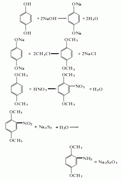 hydroquinone is dissolved in liquid alkali to form hydroquinone sodium salt. hydroquinone sodium salt and methyl chloride react at 75-120℃ and 1.3-1.7mpa pressure to generate p-dimethoxybenzene, which is then nitrated with nitric acid to generate 2,5-dimethoxynitrobenzene. it is reduced with sodium polysulfide and finally obtained by cooling, filtering and washing with water.