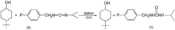 in a reaction flask equipped with a stirrer and ventilation tube , add 540 mg (3.46 mmol) 4-tert-butylcyclohexanol (2), 50 ml anhydrous benzene, and 0.2 ml anhydrous dimethyl sulfoxide containing 98 mg (1 mmol) anhydrous phosphoric acid . pour in nitrogen, add 13.19g of polymer-supported carbodiimide resin (containing 0.012 mol of activated carbon diimide) with stirring, and stir for 3.5 days at room temperature. filter and wash with ether three times, 100 ml each time. combine the organic layers and wash with water 5 times, 100 ml each time. concentrate to dryness to obtain 446-450 mg of product (1), with a yield of 83%-84%. mp42~45℃. note: ① anhydrous phosphoric acid is prepared as follows: add 3.98g of phosphorus pentoxide to 5.58ml of 85% phosphoric acid, and heat for 15 minutes to completely dissolve; or add 27ml of water dropwise to 71g of phosphorus pentoxide while cooling in an ice bath. just dissolve it completely. [2]