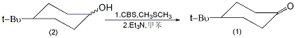equipped with stirrer, thermometer and dropping funnel , add 8.0g of cbs (0.06mol) and 200ml of toluene into the reaction bottle of the ventilation tube, and pass in argon gas. cool to 0°c with stirring, add 6 ml (0.1 mol) of dimethyl sulfide, and white precipitate appears. use carbon tetrachloride-dry ice-cooling to -25°c, add dropwise a solution of 6.24g (0.04mol) of the mixture of cis and trans isomers of 4-tert-butylcyclohexanol (2) dissolved in 40ml of toluene, and complete the addition in about 5 minutes. continue to stir the reaction at -25°c for 2 hours, then add dropwise a solution of 6.0g (0.59mol) triethylamine dissolved in 10ml toluene, and complete the addition in about 3 minutes. remove the cold bath and add 400 ml of diethyl ether after 5 minutes. the organic layer was washed with 100 ml (1%) hydrochloric acid and then 100 ml water. dry over anhydrous magnesium sulfate, and evaporate the solvent under reduced pressure. the residue was transferred to a 50ml round-bottomed flask, distilled under reduced pressure, and the fraction at 120°c/3.325kpa was collected to obtain 5.54-5.72g of compound (1), with a yield of 90%-93%. cures after standing, mp41~45℃. [3]