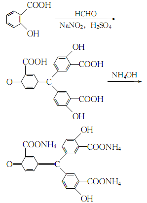 3. under rapid stirring, add solid sodium nitrite into concentrated sulfuric acid in batches, controlling the addition speed to avoid the production of red smoke. . after it is completely dissolved, add salicylic acid in small amounts in batches, control the temperature not to exceed 20°c, and stir until it is completely dissolved. the mixture will be light red to brown and viscous. cool the temperature to 0°c, slowly add 37% formaldehyde solution with rapid stirring, and keep the temperature below 5°c. after the reaction is completed, add a large amount of ice-water mixture while stirring until the solid is dispersed. the solid obtained was washed with cold water several times, filtered with suction, dissolved in 1:2 dilute ammonia water, filtered to remove insoluble matter, and evaporated to dryness to obtain yellow ammonium salt. the reaction formula is: