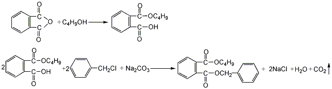 2, monobutyl phthalate is obtained by esterifying phthalic anhydride and butanol in a mass ratio of 1:0.52, and then performs a second esterification with benzyl chloride in the presence of sodium carbonate. it is obtained by neutralizing with alkali solution, washing with water and distilling under reduced pressure.