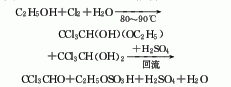 produced by the reaction of ethanol or acetaldehyde and chlorine. ethanol chlorination method: the stepwise reaction between ethanol and chlorine produces a mixture of alcoholic trichloroacetaldehyde, hydrated trichloroacetaldehyde and trichloroacetaldehyde, collectively called chlorine oil. react chlorine oil with concentrated sulfuric acid, and then use simple distillation to obtain refined trichloroacetaldehyde products. the by-product ethyl chloride can be packaged for the production of pesticides after washing with water, alkali washing, drying, condensation and distillation. hydrogen chloride can be absorbed with water to produce 30% hydrochloric acid. raw material consumption quota: ethanol (95%) 450kg/t, chlorine 2000kg/t, sulfuric acid 700kg/t.