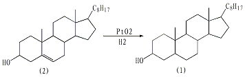 first, remove the crude cholesterol (2) 100g (0.26mol) is recrystallized with 250ml glacial acetic acid. the pure product obtained does not need to be dried and is directly added to the hydrogenation device. add 300ml glacial acetic acid and 0.5g platinum oxide. hydrogenate at 65-75℃ under slight pressure. after about 2 hours, hydrogen gas is basically no longer absorbed. after slightly cooling, the reaction mixture was filtered, concentrated under reduced pressure, and crystallized to obtain 85-90 g of crude dihydrocholesterol (containing part of cholesteryl acetate). add the crude product to 400 ml of ethanol, then mix it with a dilute alkali made of 25 g of potassium hydroxide and 100 ml of water, and react under reflux for 3 hours. cool, filter, and wash with water. the filter cake was recrystallized with 500 ml of ethanol to obtain 75-80 g of dihydrocholesterol, mp 140-141°c, and a yield of 75%-80%. [1]