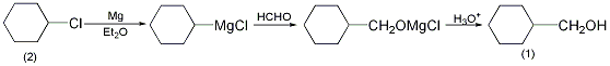 1. chlorocyclohexane, absolute ether and magnesium chips are first used to prepare grignard reagent, and then react with formaldehyde to generate cyclohexylmethanol.