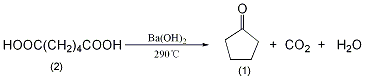 in a reaction bottle equipped with a distillation device and a thermometer (extending close to the bottom of the reaction bottle), add 200g (1.34mol) of adipic acid (2) and 10g of finely ground barium hydroxide powder, and mix thoroughly evenly. slowly heat over low heat to 285~290℃, and liquid will slowly come out. maintain this temperature until only a small amount of residue remains in the reaction flask. the distillate was saturated with calcium chloride, the organic layer was separated, washed with dilute alkali and saturated brine in sequence, dried over anhydrous magnesium sulfate, fractionated, and the fractions at 128-132°c were collected to obtain 90g of cyclopentanone (1), collected the rate is 78%. [22]