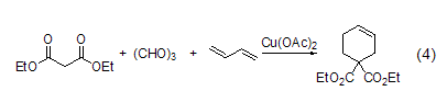 combination reaction. for example, under the catalysis of copper (ii), trimerformaldehyde and diethyl malonate undergo cyclization to form a six-membered ring compound (formula 4)[8].