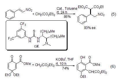 strong> the carbanion formed by diethyl malonate methylene can react with α,β-unsaturated carbonyl compounds (or analogs) to produce 1,4- conjugate addition reaction (formula 5, formula 6)[9~12].