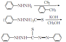 1. prepare according to the following steps. 1. preparation of phenylhydrazine dithiocarbamate salt. dissolve 13g phenylhydrazine in 60ml ether, and add 5.2ml carbon disulfide dropwise. the resulting white precipitate was filtered off and washed with diethyl ether to obtain about 15 g. 2. preparation of diphenylthiosemicarbazide. place the above product in a beaker and heat it on a water bath at 96-98°c. after the material melts, it releases hydrogen sulfide and turns into a light yellow gel. if ammonia gas is released, remove the heat bath and cool with water. cool again with ice. then cool it with ice, add 15 ml of water and absolute ethanol, take it out from the ice bath, and heat it slightly while stirring. at this time, the gelatin becomes a crystalline product, filter it with suction, and wash it with ethanol to obtain about 7.5g. 3. preparation of dithizone. add the above-obtained diphenylthiosemicarbazide to the caustic potassium solution (6g potassium hydroxide dissolved in 60ml anhydrous methanol), reflux on a boiling water bath for 5 minutes, take it out and cool it in an ice bath. filter, and the filtrate is acidified with sulfuric acid until the congo red test paper changes color and a dark blue precipitate precipitates. after suction filtration, the precipitate is treated with caustic potassium solution and sulfuric acid again. after suction filtration, it is washed with water until no sulfate radicals exist. after drying at 40℃, about 3g of dithizone is obtained.