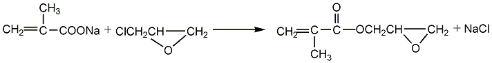 obtained from the reaction of sodium methacrylate and epichlorohydrin. raw material consumption quota: methacrylic acid780kg/t, epichlorohydrin690kg/t, sodium hydroxide330kg/. it can also be obtained by the transesterification reaction of methyl methacrylate and glycidyl alcohol. among them, the former method has easy-to-obtain raw materials and mild reaction, and is currently a commonly used method in the world. process flow:(1) preparation of methacrylic acid sodium salt equipped with a stirrer and reflux in the four-necked bottle of the condenser, thermometer and dropping funnel, add 100ml of methacrylic acid, then add 100ml of solvent, stir evenly, and slowly add 103.5g of 50% naoh aqueous solution dropwise. control the reaction temperature not to exceed 55°c. after the dropwise reaction is completed, stir for 30 minutes, add 0.2g of polymerization inhibitor p-hydroxyanisole, dehydrate under reduced pressure at 85-90°c, 30.7-36.0kpa, dry to obtain sodium salt, seal and store for later use.