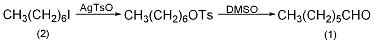in a reaction bottle equipped with a stirrer and thermometer, add 11g of silver p-toluenesulfonate ① dissolved in 100ml of acetonitrile. , cool to 0~5°c, add 7.0g (31mmol) of 1-iodoheptane (2), and stir and react at room temperature overnight in the dark. the reaction mixture was poured into ice water and extracted with diethyl ether. after drying the ether layer, the solvent was removed to obtain an oily substance. add 20g of sodium bicarbonate and 150ml of dmso to another reaction bottle, and add nitrogen gas to keep bubbling. add the above oil and heat to 150℃ (sometimes it will smoke). after 3 minutes, cool quickly to room temperature. the generated aldehyde was reacted with 2,4-dinitrophenylhydrazine to generate the corresponding phenylhydrazone, and 6.9g of phenylhydrazone was obtained with a yield of 70% and mp of 106~107°c. when standard samples are mixed, the melting point of the mixture remains unchanged. note: ① the preparation method is as follows: add equal moles of silver oxide and p-toluenesulfonic acid monohydrate into acetonitrile, stir and react for 30 minutes in the dark, and filter. the acetonitrile was evaporated, dried at 65°c, and set aside. [22]
