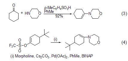 formation of imine morpholine is one of the three main secondary amines used in the synthesis of enamines. it is less basic than piperidine and tetrahydropyrrole, so the formation rate of enamine is slower than that of piperidine and tetrahydropyrrole. in the process of forming enamine, the regioselectivity of morpholine is also worse than that of pyridine and tetrahydropyrrole[4]. when synthesizing enamines from saturated aldehydes, ketones and morpholine, the reaction can be directly heated in benzene[5], or catalyzed by p-toluenesulfonic acid or titanium tetrachloride (formula 3) [6], you can also use microwave irradiation[7], or react with enol trifluorosulfonate under pd catalysis to form (formula 4)[8].