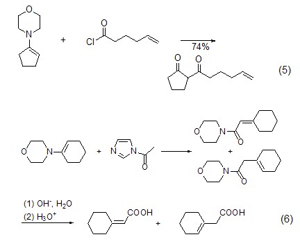 morphine enamine application although morpholine is not very active when synthesizing enamines, it has a high yield when synthesizing pyrrolidone derivatives. a typical example is the acylation of cyclopentenomorpholine enamine (formula 5)[9]. the reaction with acetylated imidazole can also form amide of morpholine enamine, and acidification is obtained after acidification (formula 6)[10].