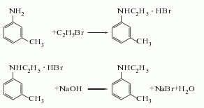 use m-toluidine as raw material, heat it up in the reaction kettle, add bromoethane solution dropwise at a certain temperature, maintain reflux for several hours, add alkali solution to neutralize, separate, and obtain the finished product through rectification .