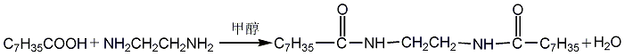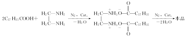 3. add the measured ethylenediamine and antioxidant into the ethylenediamine metering tank, and then put a certain amount of stearic acid into the reaction kettle. replace the air in the reaction kettle with n2 three times, then add ethylenediamine, and heat the oil bath in the jacket of the reaction kettle. when the stearic acid is completely melted, start stirring and continue to heat up under the protection of nitrogen flow. control the heating rate. when the temperature reaches 120°c, react at a constant temperature for 2 hours. then add the catalyst to continue heating and control the heating rate. when the temperature reaches 180°c, keep the temperature constant for 3 hours. ~4h. determine the acid value of the product. if the acid value does not reach <10 mgkoh/g, add a catalyst and raise the temperature to 200°c until the acid value is qualified. then it is cooled to 160°c, quickly discharged, formed into flakes, and then crushed into products. the synthesis reaction formula is as follows: