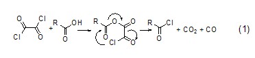 similar to thionyl chloride, the reaction between oxalyl chloride and acid will give gas by-products, and the generated chloride can be easily separated (formula 1)[1].
