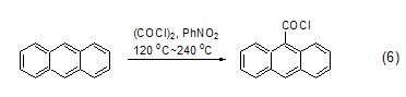 oxalyl chloride can also be directly converted into an alkane or a chlorocarbonyl group is introduced into a cycloalkane compound, but usually the reaction results in a mixture. aromatic hydrocarbon compounds can also undergo chlorocarbonylation reaction under the action of oxalyl chloride and lewis acid. among them, anthracene can also react directly without a catalyst (formula 6)[6].