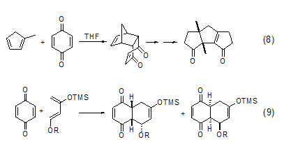 1,4-benzoquinone another important class of reactions is as dienophiles. because of the electron-withdrawing effect of the carbonyl group, 1,4-benzoquinone is a good electrophile, and the diels-alder reaction can be easily achieved in the presence of electronegative diene substrates. a typical example is the diels-alder reaction of 1,4-benzoquinone and 1-methyl-1,3-cyclopentadiene in the total synthesis of capnellene reagent, which provides a good reaction precursor for the final product ( formula 8)[8]. in addition, there are many reports on the asymmetric diels-alder reaction involving 1,4-benzoquinone (formula 9)[9].