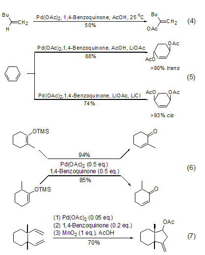 in addition, the 1,4-benzoquinone and palladium acetate oxidation system can also realize the conversion of methylsilane enol ether to conjugated enone, and the reaction has very good regioselectivity and stereoselectivity ( formula 6)[6]. combining 1 part of manganese oxide reagent, 0.05 part of palladium acetate and 0.2 part of 1,4-benzoquinone can also achieve the oxidative ring-closure reaction of 1,5-hexadiene, and obtain cyclopentane derivatives with high yield (formula 7) [7].