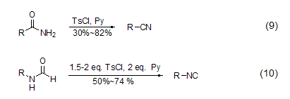 primary amide compounds in tscl and nitrile (formula 9) [9] can be obtained under the action of pyridine, while a similar formamide substrate can generate isonitrile (formula 10) [10] under the action of tscl and pyridine. sup>.