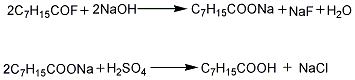 2. put the raw materials octanoyl chloride (purity 99.5%), hydrogen fluoride and a small amount of n-butyl sulfuric acid into the electrolytic cell, energize at 20~25℃ (voltage 5~8), electrolysisthe product is neutralized with alkali, acidified with acid, and distilled to obtain perfluorooctanoic acid.
