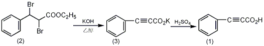 in a reaction bottle equipped with a stirrer and a reflux condenser , add 1.2l of 95% ethanol and 252g of potassium hydroxide (4.5mol), stir to dissolve. cool to 40~50°c, add 336g (1.0mol) of α,β-dibromo-βphenylpropionic acid ethyl ester (2), and heat to reflux for 5 hours after the reaction becomes stable. cool, filter out the precipitate (retained), adjust the filtrate to neutrality with concentrated hydrochloric acid, then filter out the precipitate (retained), and recover ethanol by distillation under normal pressure. combine the residue with the precipitate (3) filtered above, dissolve it in 800 ml of water, and add crushed ice to make it about 1.8l. use 20% sulfuric acid in an ice water bath to make it highly acidic ①, and a light brown solid will precipitate. filter it with suction and wash with 2% dilute sulfuric acid. dissolve the filtered solid in 1.5l (5%) sodium carbonate, decolorize with activated carbon, filter with suction, cool and add 200g of crushed ice. adjust to strong acidity with 20% sulfuric acid, precipitate the solid, suction filter, wash with 2% sulfuric acid and water in sequence, and dry in a vacuum dryer to obtain 115g of phenylpropinoic acid (1), with a yield of 79%. recrystallize with carbon tetrachloride to obtain 70g of pure product, mp 135~136℃. note: ① when adding sulfuric acid, it should be done at low temperature as much as possible to prevent decarboxylation reaction. [1]