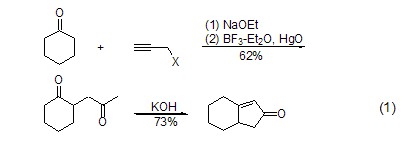 propargyl halide can also be used in ring-enlarging reactions. for example, after the alkylation reaction between propargyl bromide and the substrate, mercury oxide is added to obtain an acetone-like alkylation product. when the alkylation reaction occurs at the ortho position of the carbonyl group, further intramolecular cyclization reaction can occur to obtain the cyclopentenone compound (formula 1)[2].
