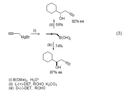 as a halide, propargyl bromide can also be converted into various organometallic reagents, and then undergo chiral addition reactions with aldehydes or ketones in the presence of diethyl tartrate (formula 3)[5].
