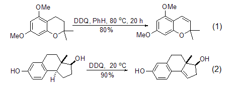 under the action of ddq, the transfer process of substrate hydrogen ions to ddq can occur, thereby realizing the dehydrogenation reaction of the substrate, and ddq is converted into diphenol. therefore, the dehydrogenation reaction is related to the stability of the carbocation formed initially in the reaction, and is particularly effective for compounds with ortho-stabilizing functional groups. inert hydrocarbons are very stable to ddq, while substrates containing alkenyl or aryl groups can be oxidized by ddq to obtain conjugated products (formula 1, formula 2)[2,3].