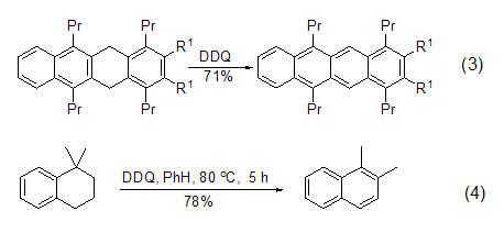 ddq is a very effective aromatic kylating reagents are often used in the dehydrogenation reaction of simple or complex hydrogenated aromatic carbocyclic compounds to obtain conjugated aromatic compounds (formula 3)[4]. the oxidative dehydrogenation reaction of quinone compounds usually does not cause skeletal rearrangement, but 1,1-dimethyltetrahydronaphthalene can easily undergo aromatization reaction accompanied by 1,2-hydrogen transfer under the action of ddq (equation 4) [5].