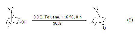 ddq can also be used in alcohols the oxidation reaction of the compound oxidizes the hydroxyl group to the carbonyl group. saturated alcohols are stable to ddq in the absence of light, while some sterically forbidden secondary alcohols are easily oxidized by ddq to the corresponding ketones (formula 9)[10].