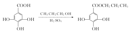 1. obtained from the esterification of gallic acid and propanol. add gallic acid, propanol, benzene, sulfuric acid and p-toluenesulfonic acid to the glass-lined reaction pot, heat and dehydrate, recover benzene, and leave for 2 hours. pour into water and leave for 24 hours. the crude product is obtained by filtration. the crude product is dissolved in ethanol and filtered. the filtrate is added to water to crystallize, filtered and dried to obtain the finished product. 1. preparation of gallic acid