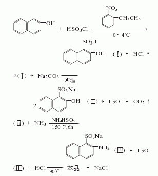 2-naphthol is sulfonated with chlorosulfonic acid in o-nitroethylbenzene solvent to generate 2-naphthol-1-sulfonic acid, which is neutralized with soda ash 2-naphthol-1-sodium sulfonate is separated and ammonolyzed with liquid ammonia in the presence of ammonium bisulfite to obtain 2-naphthylamine-1-sodium sulfonate, which is then acidified with hydrochloric acid and filtered to obtain 2-naphthylamine. amine-1-sulfonic acid.