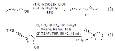 claisen rearrangement under acid catalysis, triethyl orthoacetate can react with allyl alcohol to form a c-c bond (formula 3)[4], which is essentially a claisen rearrangement of alkoxy groups. this reaction may produce a variety of chiral isomers with certain spatial selectivity (formula 4)[5].