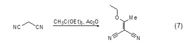 carbon-carbon double bond formationtriethyl orthoacetate can be used as a nucleophile to attack carbon atoms with lower electron cloud density to form carbon-carbon double bonds, such as its reaction with 1,3-malononitrile (formula 7) [8].