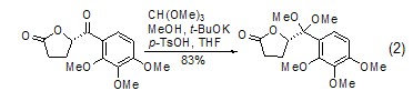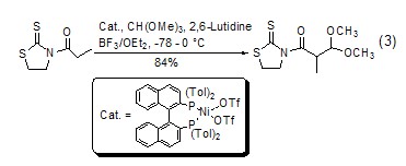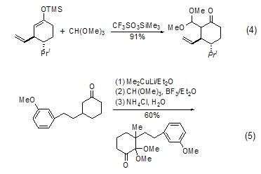 with enol ( or analogues) reaction the silyl ether of enol (formula 4)[7] or the enolate of ketone (formula 5) [8] can be reacted with the carbonium ion generated in situ by orthoformate reacts to generateβ-acetal ketone compounds.