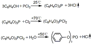 2. phosphorus trichloride indirect method (also known as cold method): after phenol is melted, phosphorus trichloride is added dropwise at 25°c with stirring to generate triphenyl phosphite; then the temperature is raised to 70°c and chlorine gas is introduced to generate dichlorophosphoric acid triphenyl ester; then add water for hydrolysis at 50℃ to generate triphenyl phosphate. finally, the hydrolyzate is neutralized, washed, evaporated and distilled under reduced pressure with 5% soda ash aqueous solution. the fractions at 243~245℃ (1.47kpa) are collected, cooled, crystallized, crushed and packaged to become the finished product.
